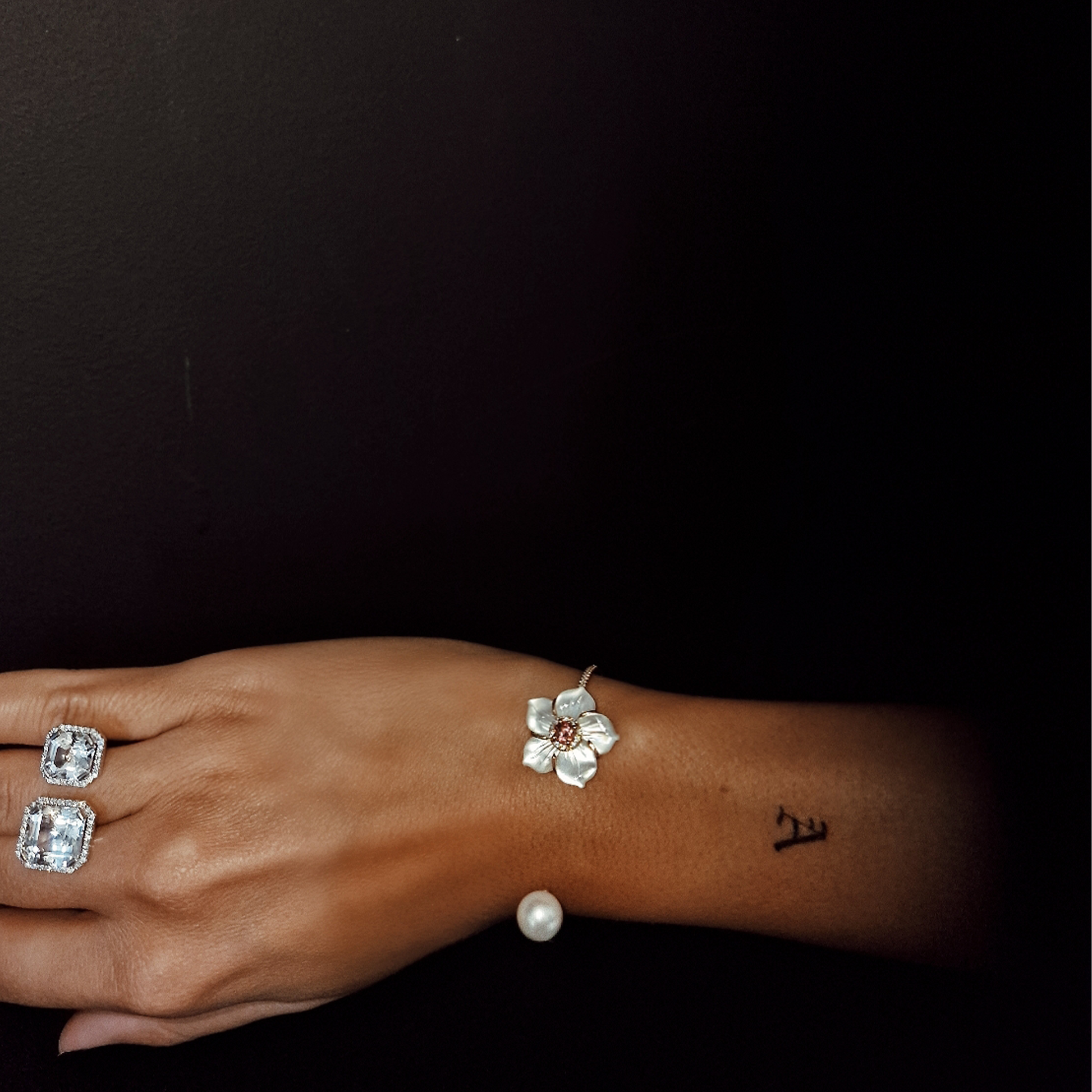 Crafted in 18kt gold, the Camelia Bracelet is an enchanting piece featuring a delicately crafted pearl flower with a gemstone at its heart, seamlessly balanced by a larger, luminescent white pearl on the opposite side. Designed to create a captivating optical illusion, it gives the appearance of two floating elements adorning your wrist. The Camelia Bracelet is a symphony of sophistication, where the harmonious blend of pearls and gemstones adds a touch of enchantment to your every movement.Onderkant formulier