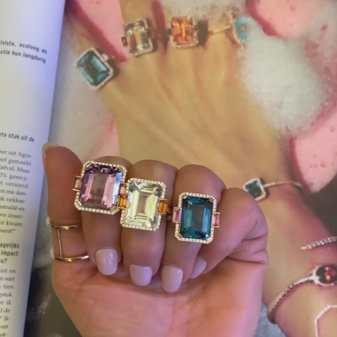Bergman Jewels' 18kt gold Manhattan XL ring is named after the “cocktail rings" in homage to the statement rings of the Roaring Twenties. The cocktail ring is believed to have originated from these Prohibition-era cocktail parties. As women sipped their forbidden cocktails, they adorned themselves with extravagant, oversized rings designed to catch attention and spark conversation. These rings were often characterized by large, colorful gemstones and intricate designs, making a bold statement on the wearer's finger. Today, Bergman Jewels brought the cocktail ring back and now they are worn for various occasions and are not limited to cocktail parties. They are statement pieces that add a touch of glamour to any outfit, often featuring large, eye-catching gemstones and intricate settings. The cocktail ring has become a timeless accessory, paying homage to its roots in the lively and rebellious spirit of the Prohibition era.