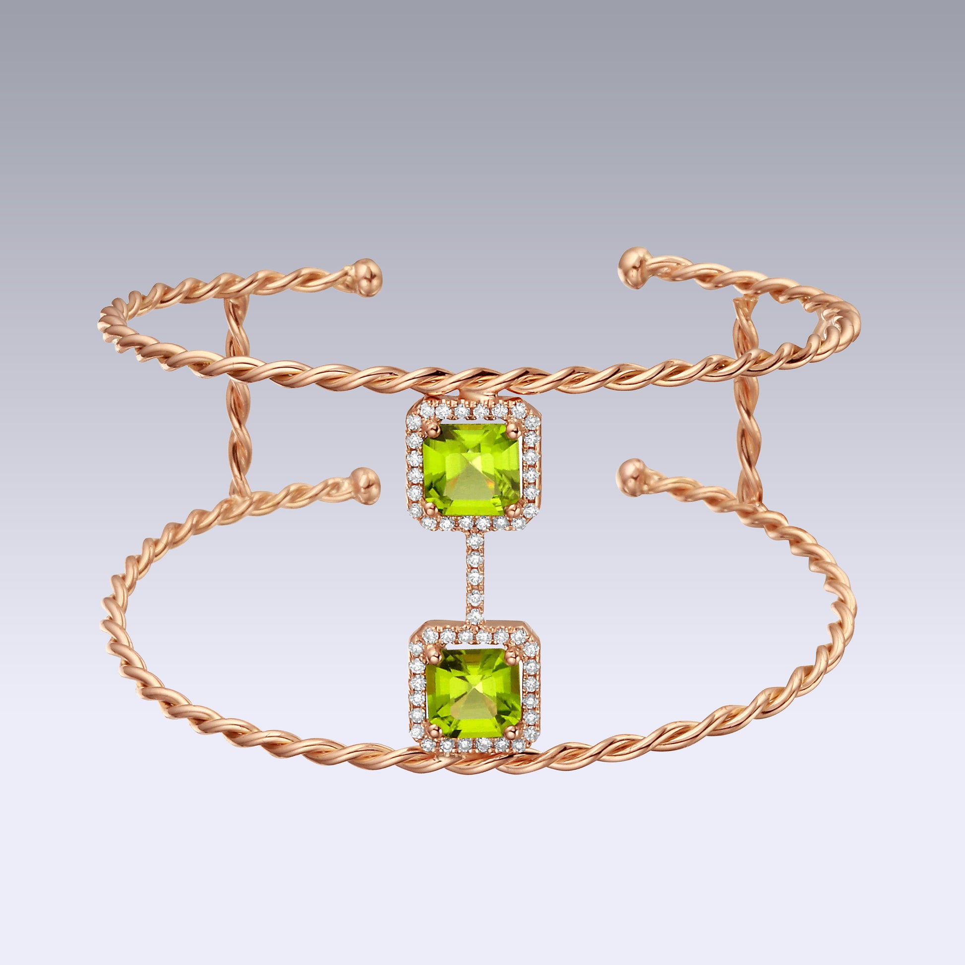 This extraordinary Twisted Bracelet, with its captivating design and radiant gemstones, has the power to elevate not just your outfit but your entire presence, transcending the realm of a mere accessory. Crafted in 18kt gold, this bracelet boasts two gracefully intertwined bands connected by a mesmerizing centerpiece. Adorned with two exquisite gemstones encircled by diamonds, the bands unite seamlessly through a bridge of radiant diamonds. This masterpiece captures the essence of modern luxury, where the fluidity of design meets the brilliance of carefully selected gemstones.