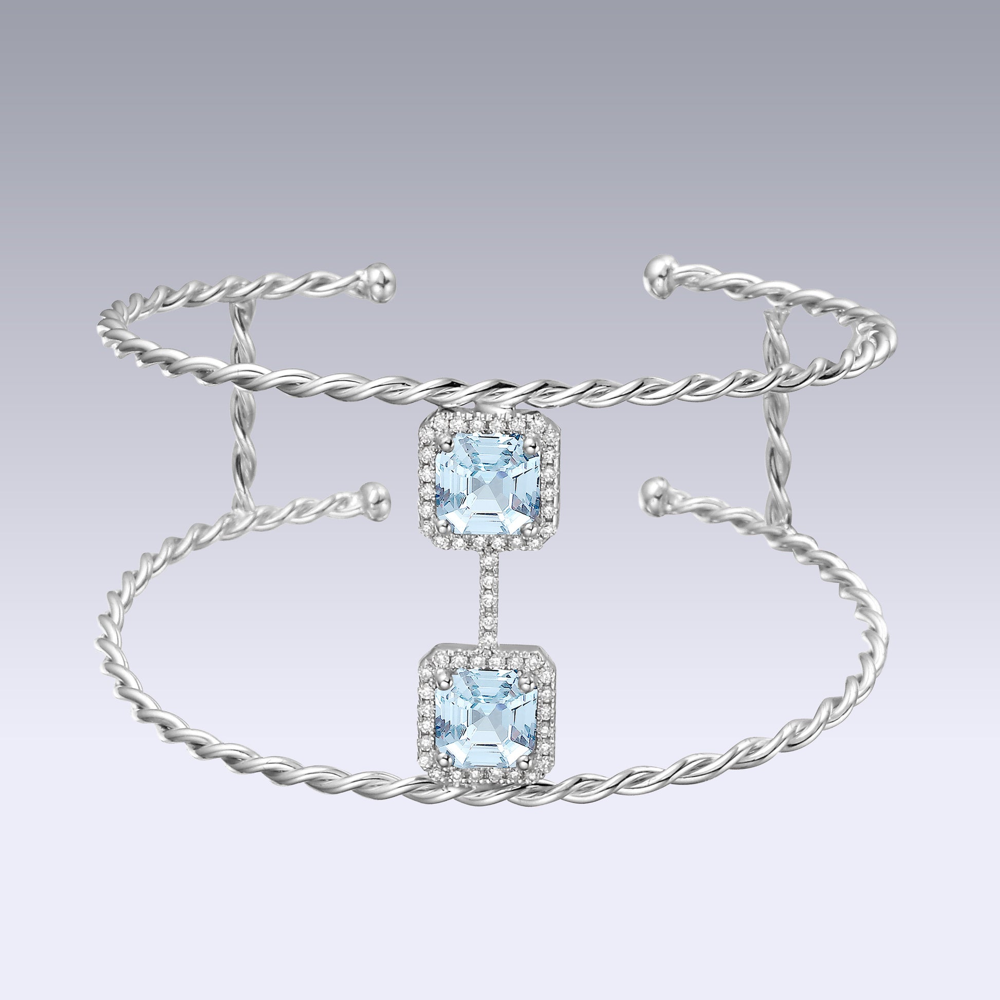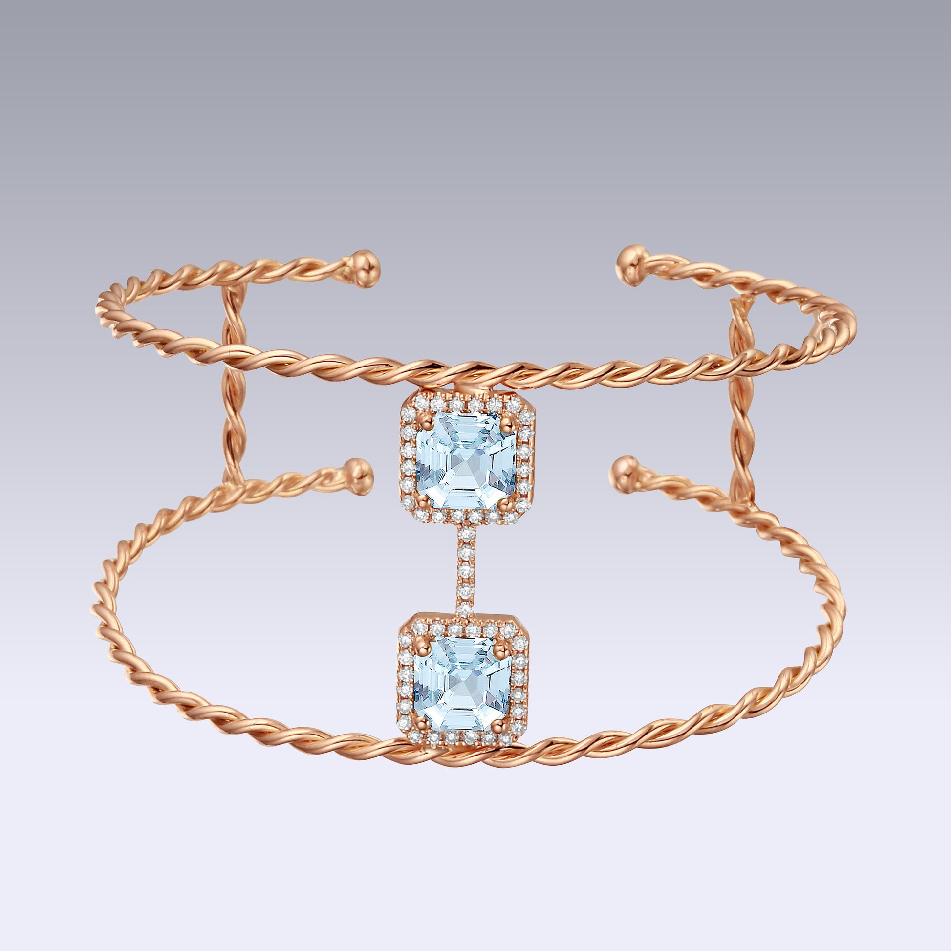 This extraordinary Twisted Bracelet, with its captivating design and radiant gemstones, has the power to elevate not just your outfit but your entire presence, transcending the realm of a mere accessory. Crafted in 18kt gold, this bracelet boasts two gracefully intertwined bands connected by a mesmerizing centerpiece. Adorned with two exquisite gemstones encircled by diamonds, the bands unite seamlessly through a bridge of radiant diamonds. This masterpiece captures the essence of modern luxury, where the fluidity of design meets the brilliance of carefully selected gemstones.