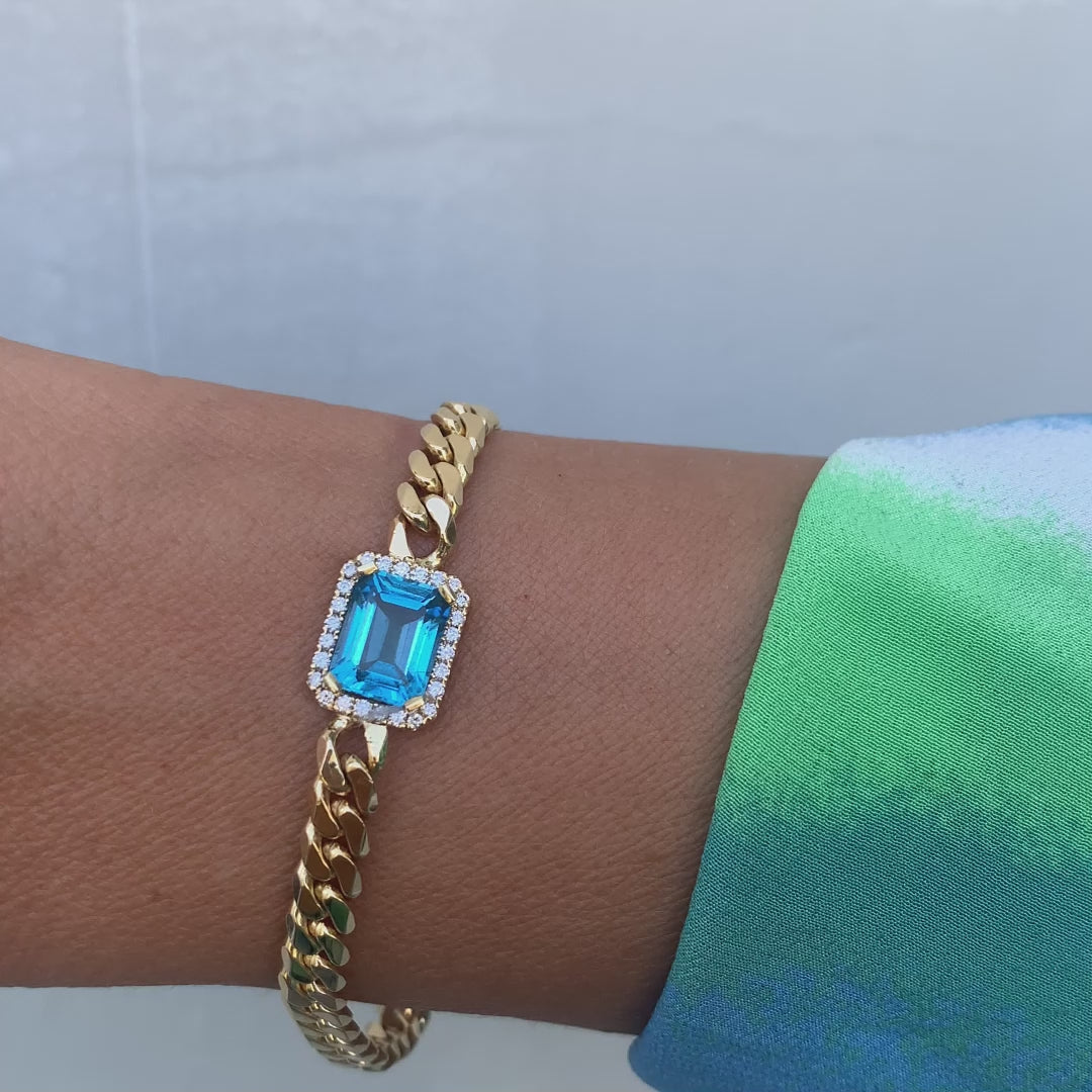 Elevate your look with the Vintage Bracelet, a fusion of vintage allure and contemporary sophistication. It combines a thick solid 18 Kt. Yellow gold gourmet chain with a diamond surrounded precious gemstone. Designed to be an elegant everyday accessory yet a luxurious statement piece.